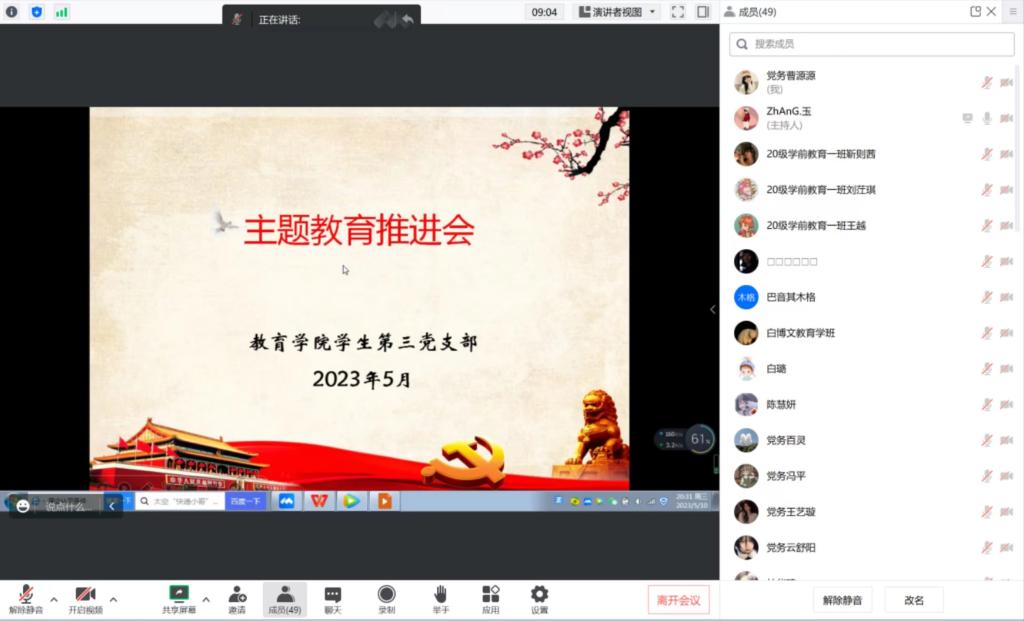 2023年5月10日晚,教育学院学生第三党支部召开学习贯彻习近平新时代中国特色社会主义思想主题教育推进会。学生第三党支部支部书记张玉同志主持会议并作动员讲话,强调开展学习贯彻习近平新时代中国特色社会主义思想主题教育是党的二十大作出的重大部署,全体党员要坚持学习贯彻习近平新时代中国特色社会主义思想,坚决按照学校、学院党委要求,切实开展主题教育,深刻认识开展主题教育的重要意义,准确把握主题教育的目标要求,力争通过理论学习、调查研究、学习探讨、微党课宣讲等方式,深化支部党员对“强国有我,请党放心”的认识与实践,不断坚定信仰、主动担当、提升本领、追求卓越。