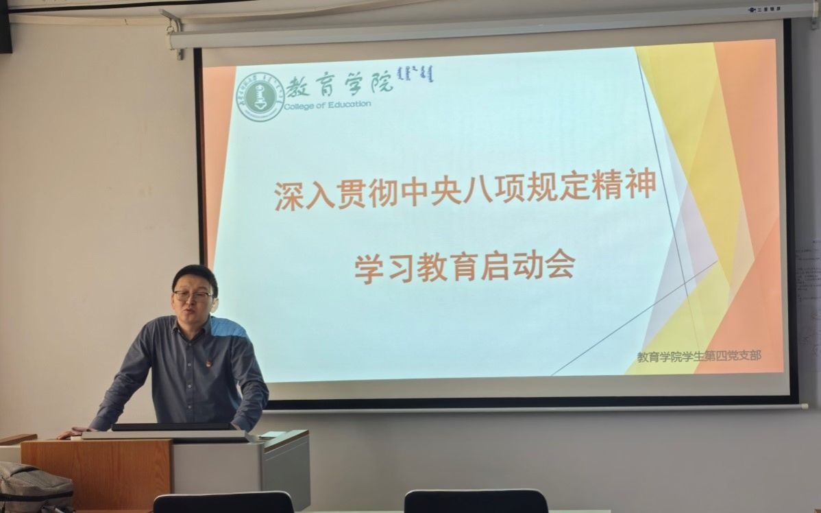 为深入贯彻落实中央八项规定精神,响应中共中央办公厅印发的《关于在全党开展深入贯彻中央八项规定精神学习教育的通知》的要求,教育学院学生第四党支部于327日在学院楼415教室召开深入贯彻中央八项规定精神学习教育启动会。会议由党支部书记斯琴满都呼主持,支部全体党员参加。
