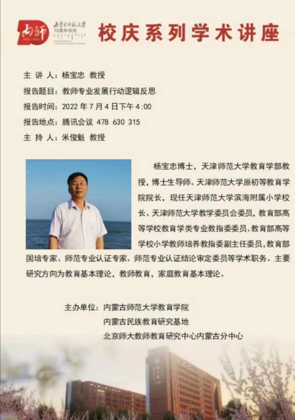 2022年7月4日,天津师范大学教育学部博士生导师、杨宝忠教授,通过腾讯视频会议,线上为教育学院全体师生,做了题为“教师专业发展行动逻辑反思”的学术报告。报告会由米俊魁院长主持,小学教育专业200多位师生聆听了学术报告。