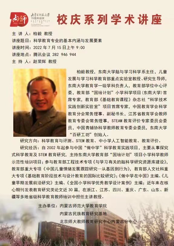 715日上午,我院邀请东南大学脑与学习科学系主任柏毅教授,为教育学院全体师生通过腾讯视频会议,做了题为“教育科学专业的基本内涵与发展要求”的学术报告。报告由教育学院、内蒙古民族教育基地、北师大教师教育研究中心内蒙古分中心主办,赵荣辉副院长主持,小学教育专业300多位师生聆听了报告。