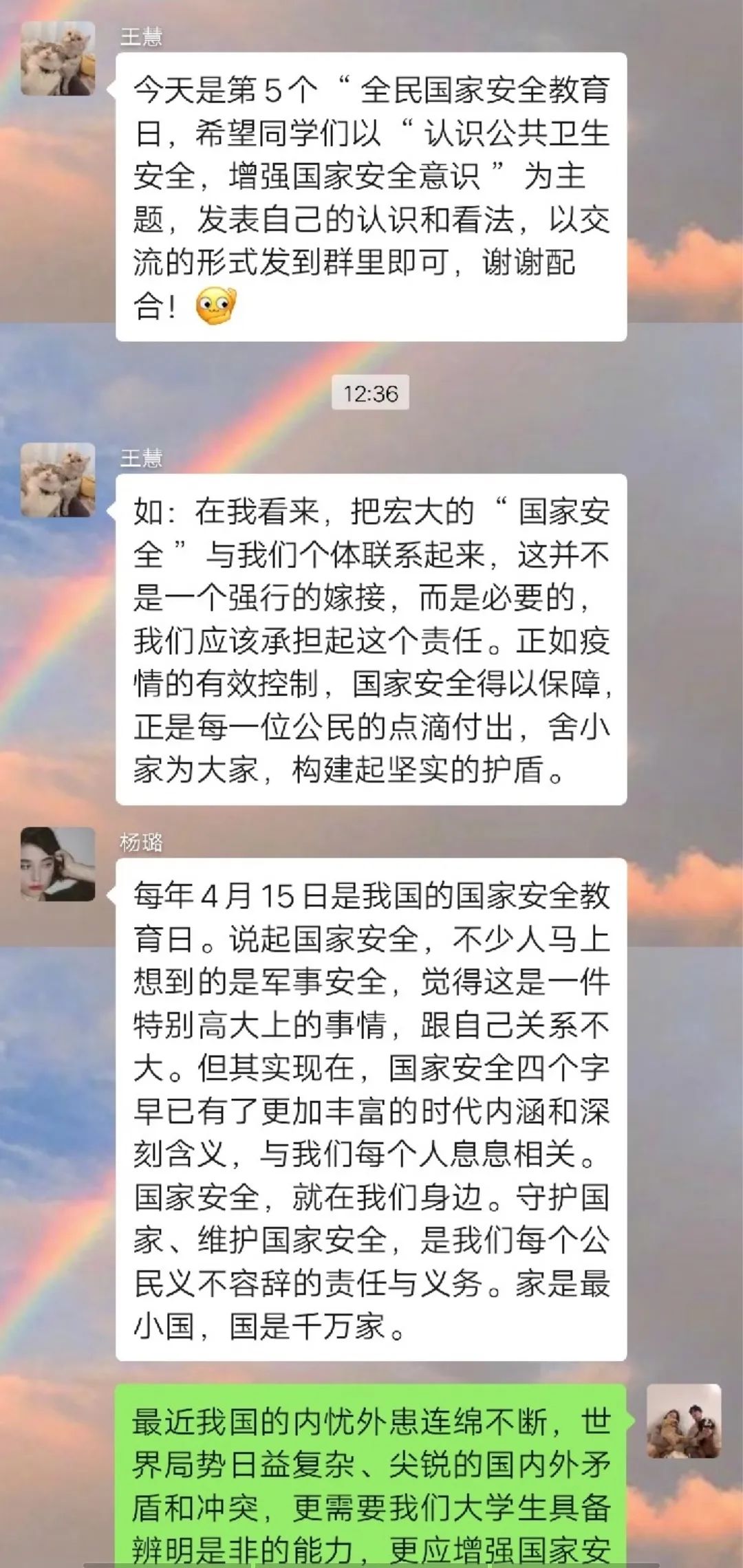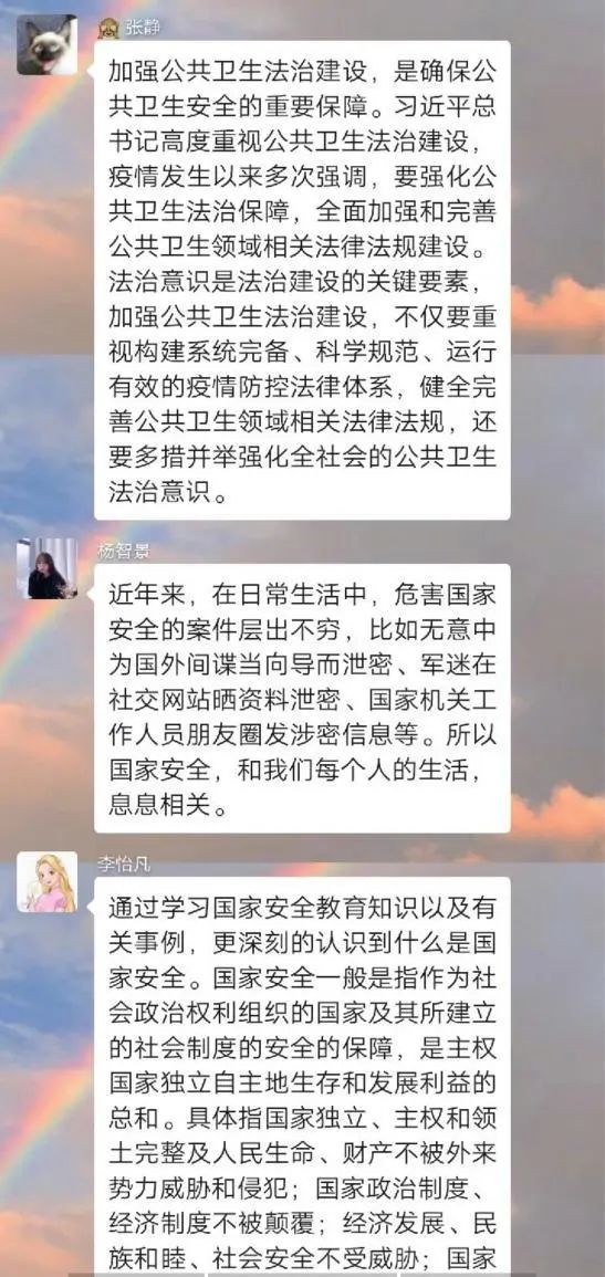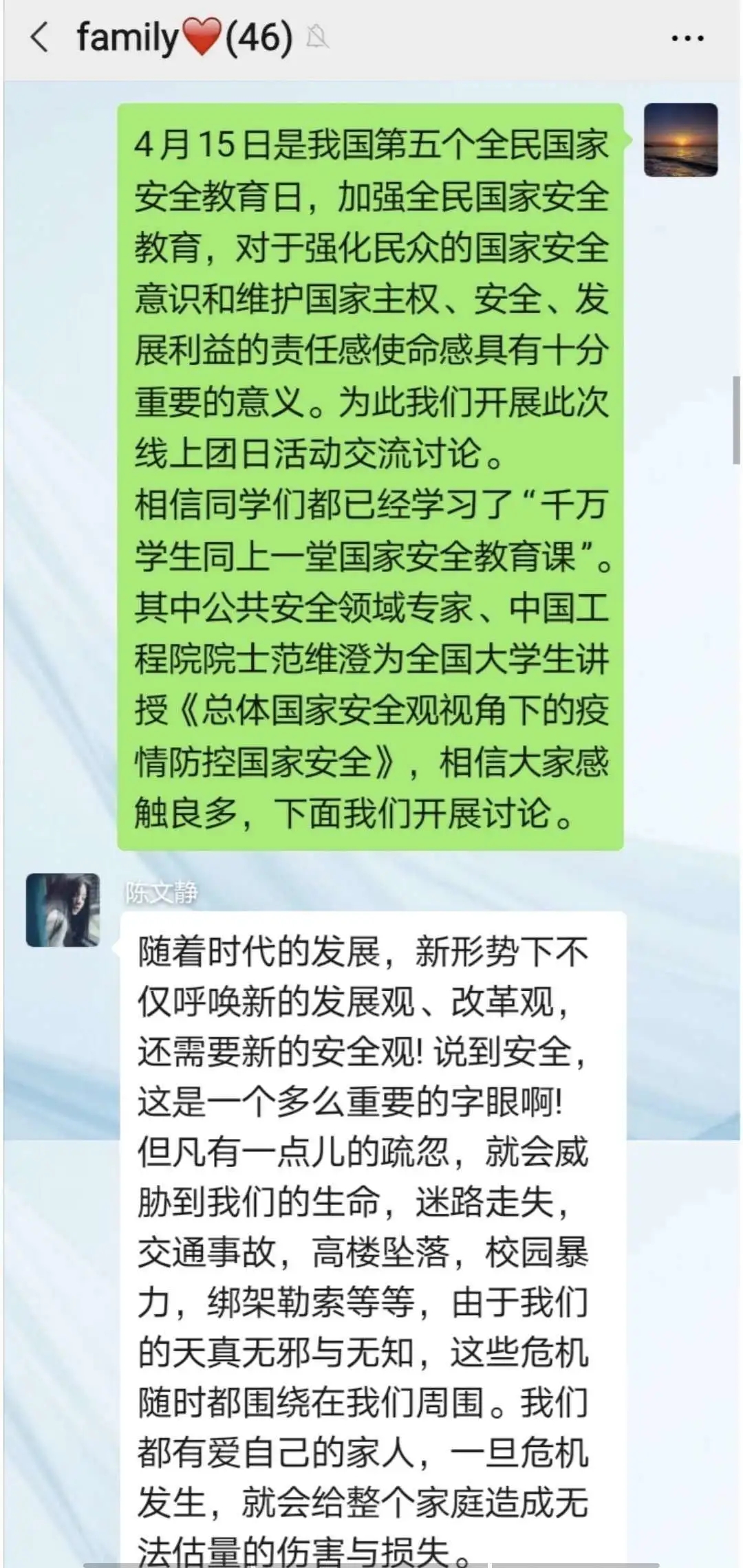 为深入学习贯彻以习近平同志为核心的党中央关于疫情防控工作的决策部署,引导学生将总体国家安全观贯穿抗疫全过程,履行应对突发公共事件的职责义务,提升维护国家安全的自觉性和主动性,我院各团支部举办以“深入认识公共卫生安全,增强国家安全意识”为主题的团日活动。通过线上交流、分享心得的方式,加强同学们对国家安全的认识,使国家安全教育深入到每个人心中。