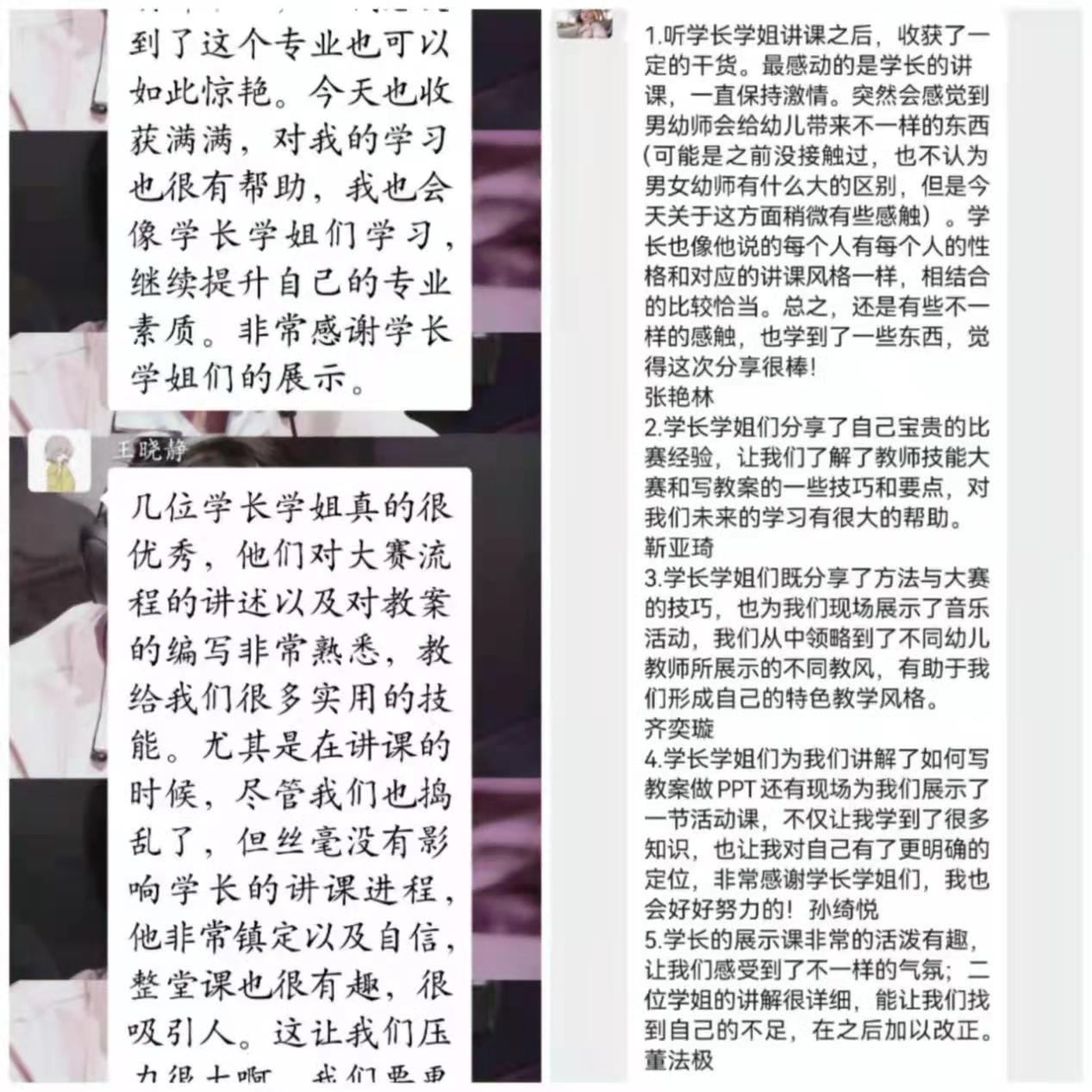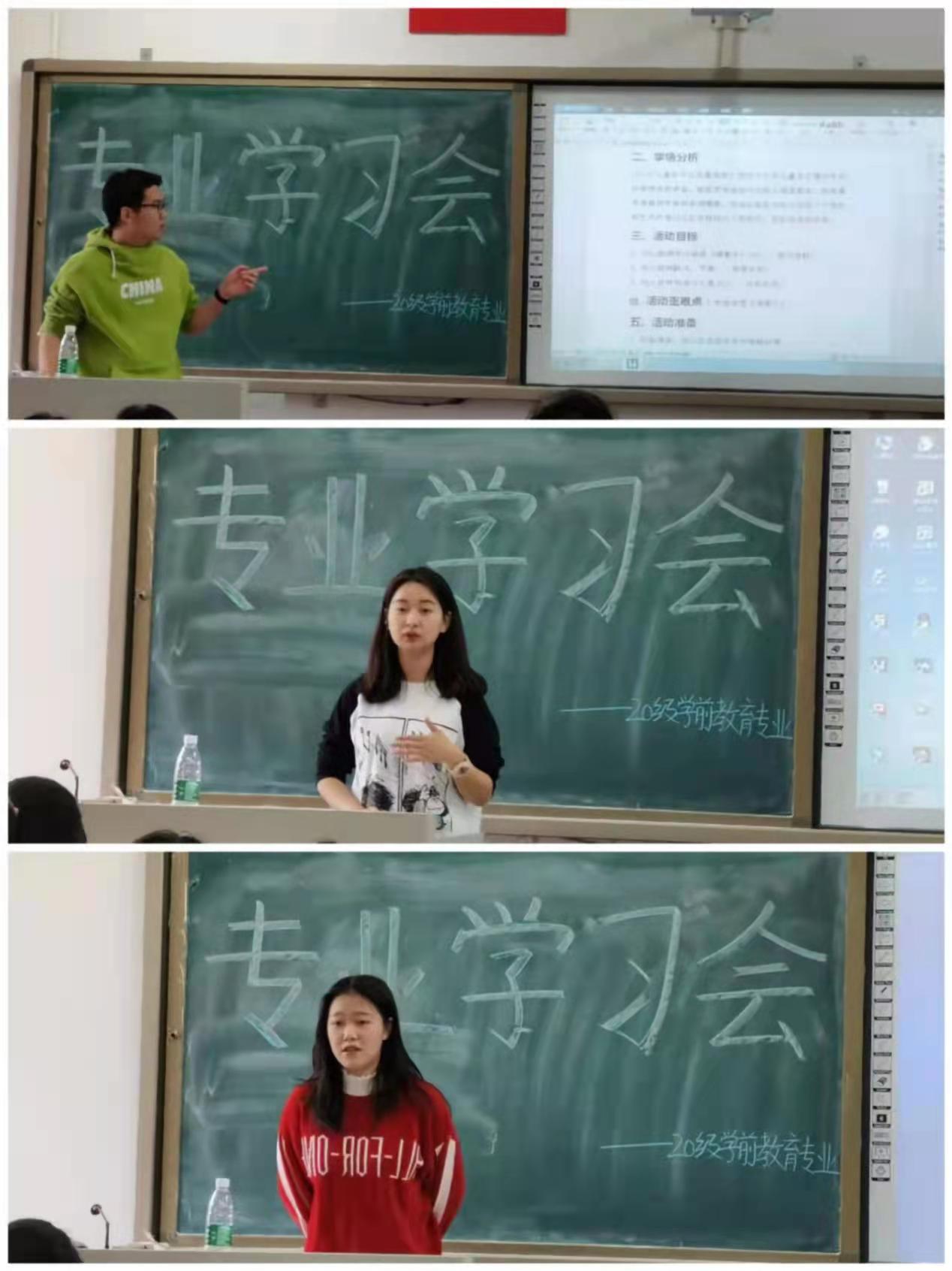 为发扬学前专业良好的帮传带作风,促进参赛选手进行自我反思、自我内化。于2021114日老师们组织了专业学习会,20193位学长学姐们对2020级的学弟学妹们进行了模拟课堂展示,分享如何书写教案以及如何制作PPT的心得体会,学弟学妹们收获颇丰。分享结束后2020级同学们针对自身问题与学长学姐交流,学长学姐结合自身实际与老师的教诲进行答疑解惑。本次专业学习会为2020级同学日后的学习与自己未来的发展方向的指引起到了巨大的促进作用。