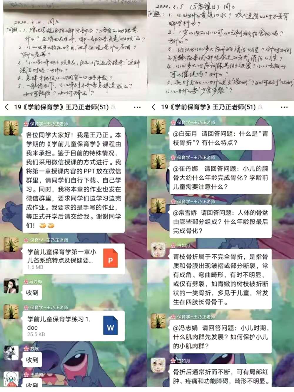 在学校敲定开学延迟通知之时,王老师和我就一直在沟通交流如何做好线上的教学,怎样保证同学们的学习质量,争取做到线上教学与线下自学同步,让同学们在家里也能掌握新知识。但是由于网上直播软件操作较为复杂,王老师操作有些困难。所以我们最后确定通过建立微信群,以群内提问、讨论的形式来开展我们的课堂教学。在微信群内,老师提供了参考资料PPT以及关于学前保育学的各种练习题,方便同学们学习和练习。