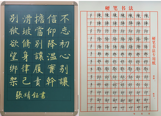 回顾四个月前,她刚一进入乌海市实验小学,就被仿古样式的教学楼与古朴的兰亭影墙吸引了。学校不愧为“中国书法兰亭小学”,校园内随处都可欣赏到师生的书法作品,语文教师更是每天严格落实一节课的写字训练。有了大学期间的写字课程、二课堂及社团活动,再加上实习学校浓厚的书法文化氛围,张婧钰同学的粉笔字、钢笔字和毛笔字都得到了巨大的提升。