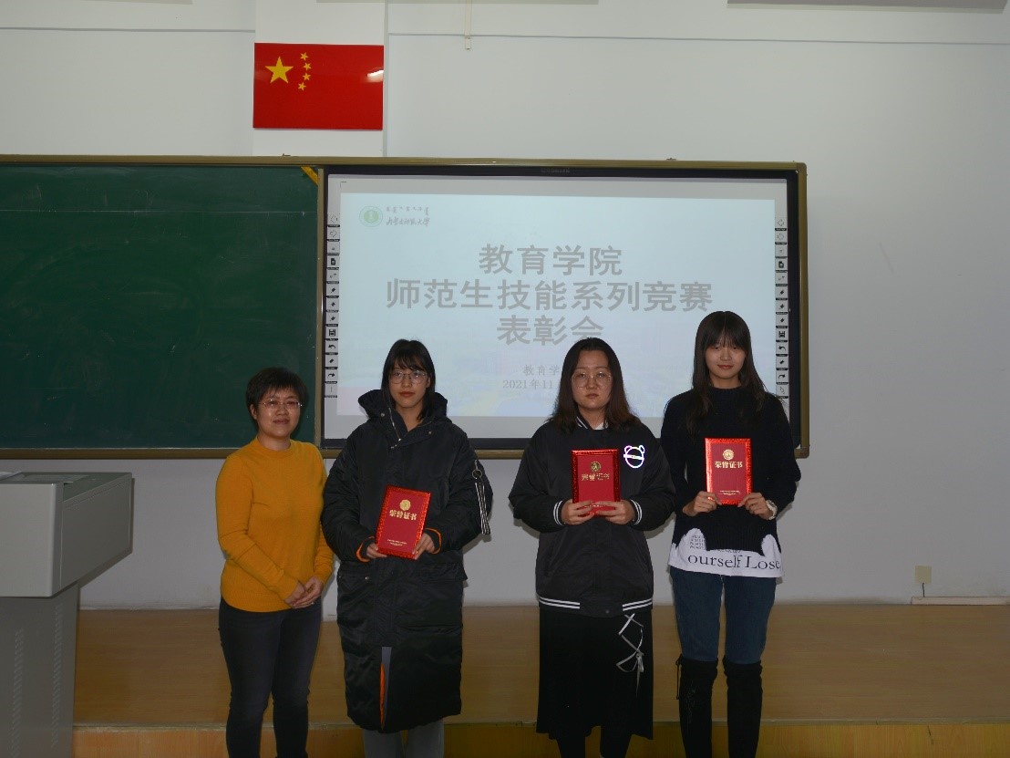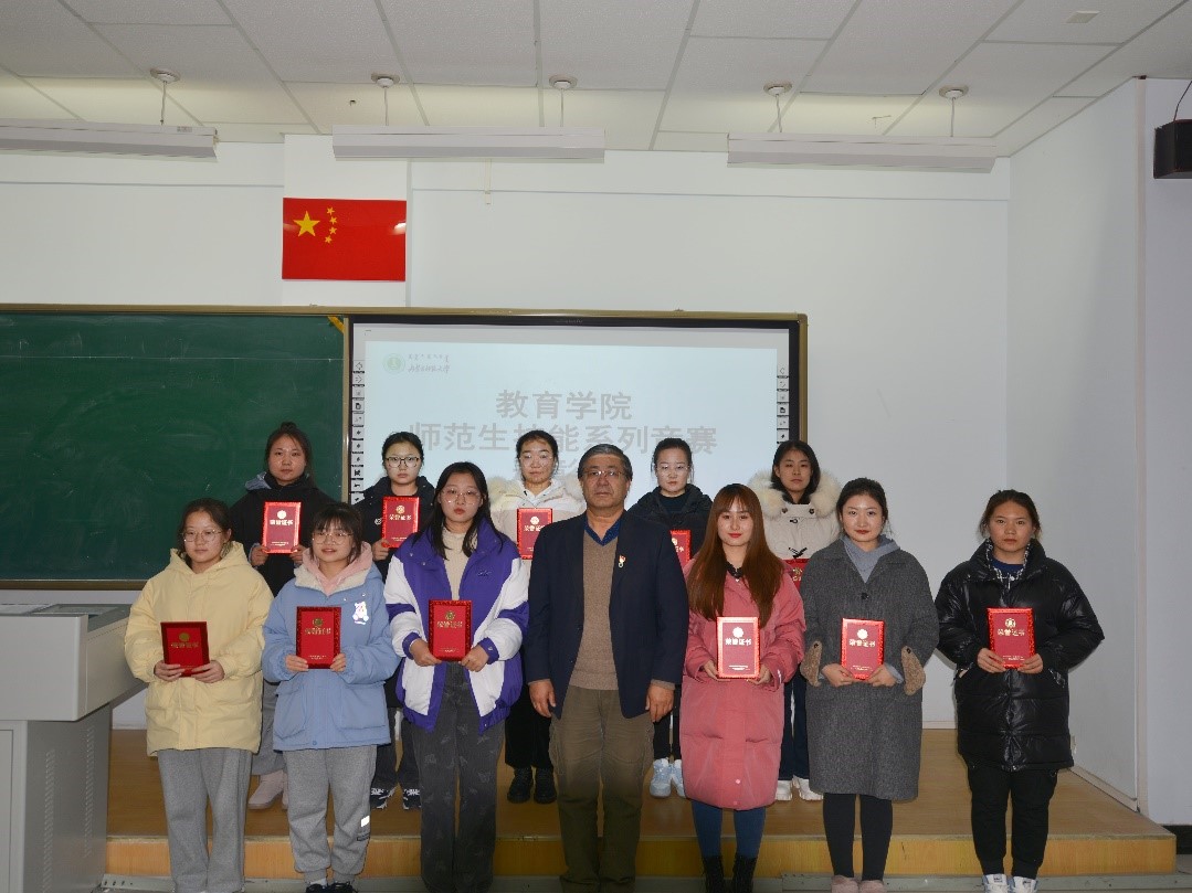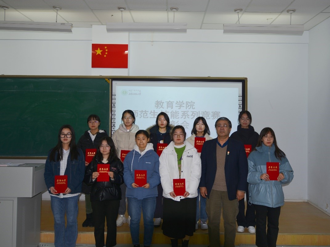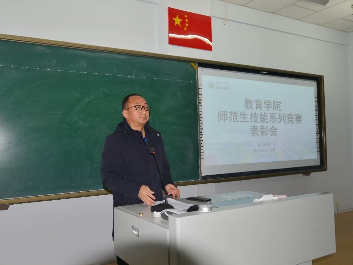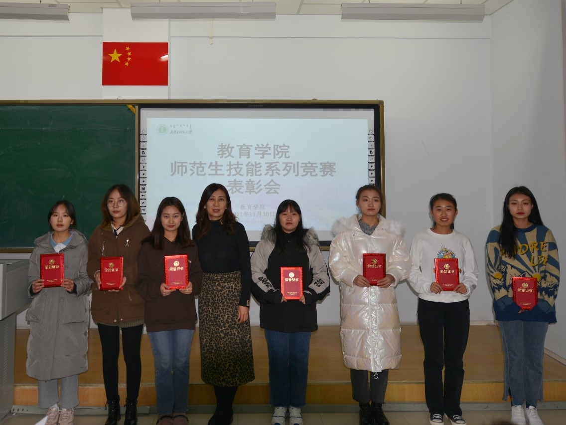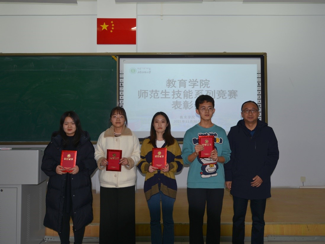 为构建以赛促练、赛练结合的师范生教学技能训练模式,加强师范生职业能力培养、加强高师范生职业能力培养、切实提升师范生的教学基本功与教学技能,有效落实教务处《关于举办第十届师范生教学技能竞赛、第二届本科生教具制作比赛、2021级师范类新生板书比赛的通知》《关于举办内蒙古师范大学2021年大学生人文知识竞赛的通知》,11月30日下午,教育学院师范生技能系列竞赛表彰大会在盛乐校区行知楼309教室隆重举行。特邀教育学院铁木尔书记、边琦副院长,以及各专业、实践部、公共教研室和学工办的老师们,各班级获奖学生代表参加本次表彰大会。