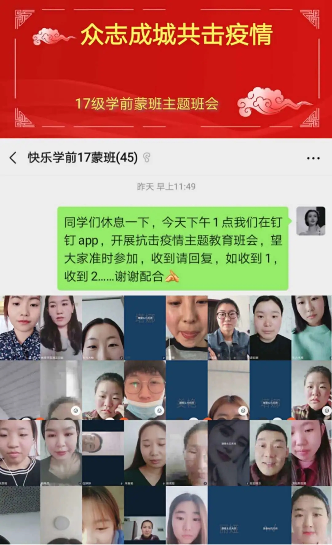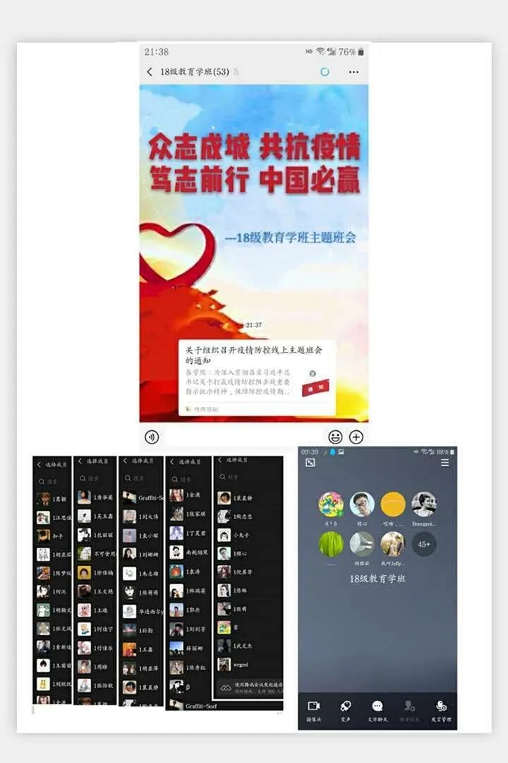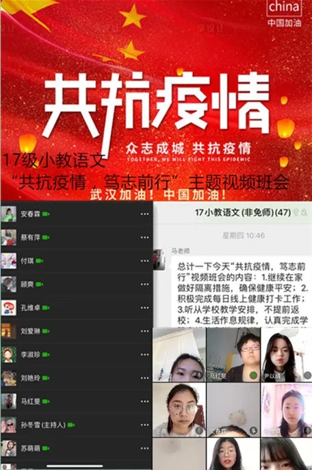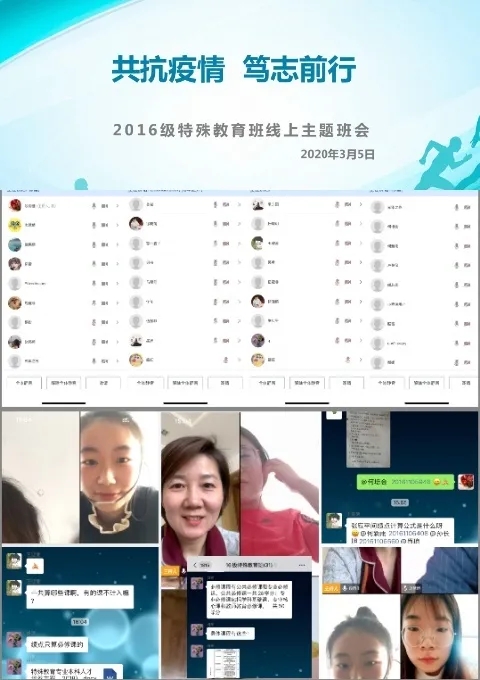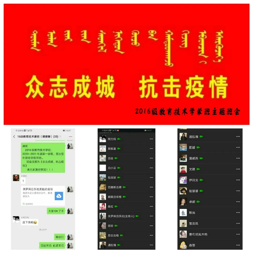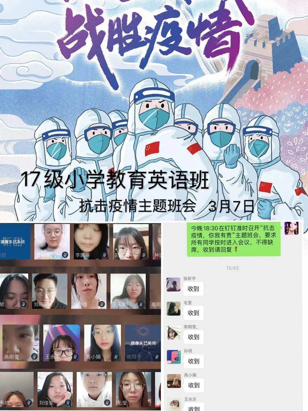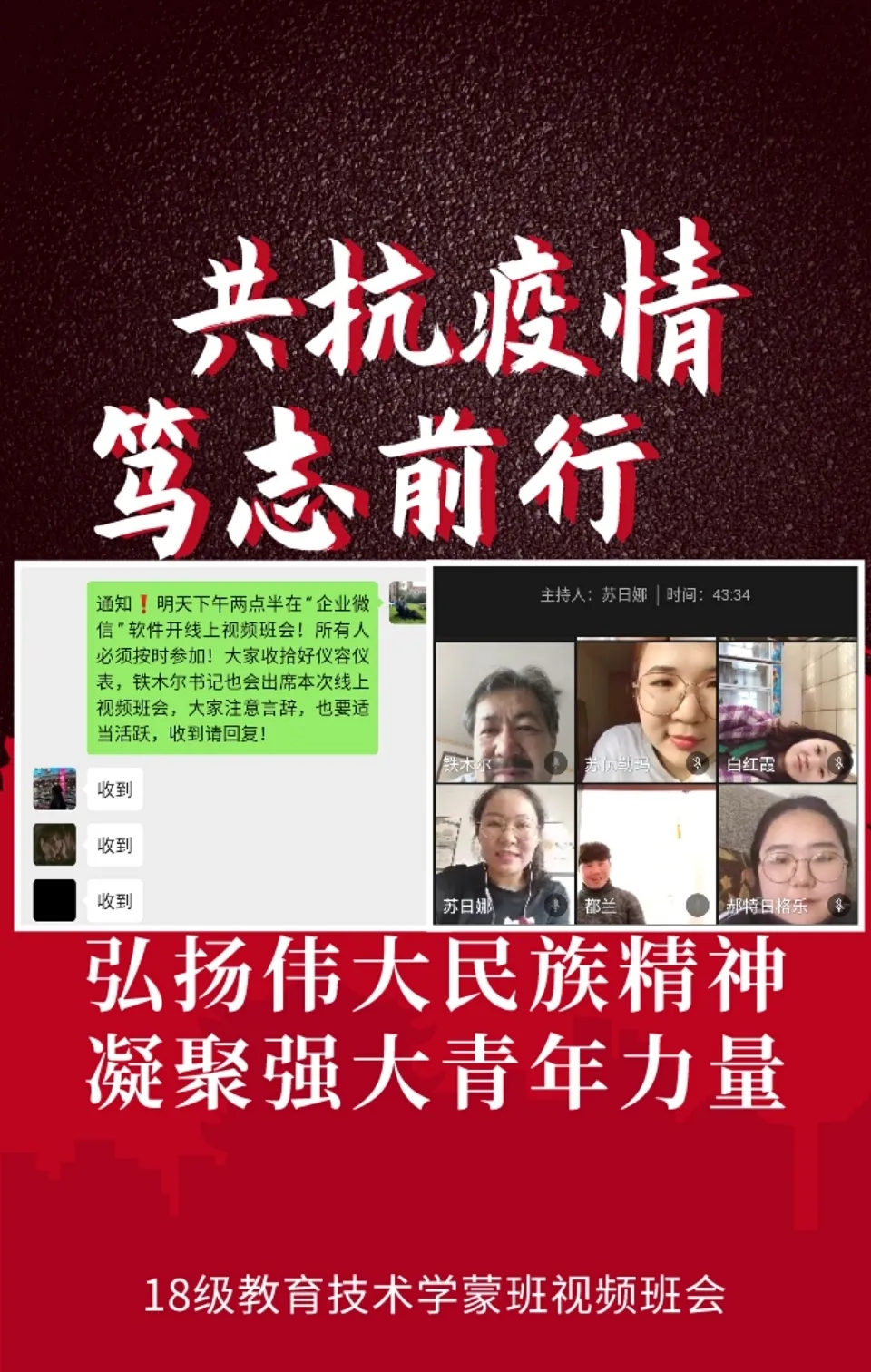 为深入贯彻落实习近平总书记关于打赢疫情防控阻击战重要指示批示精神,保障防控疫情期间“停课不停学”,充分发挥网络育人功能,根据自治区和学校有关工作部署,教育学院各班级组织召开“共抗疫情,笃志前行”为主题的疫情防控线上班会。
