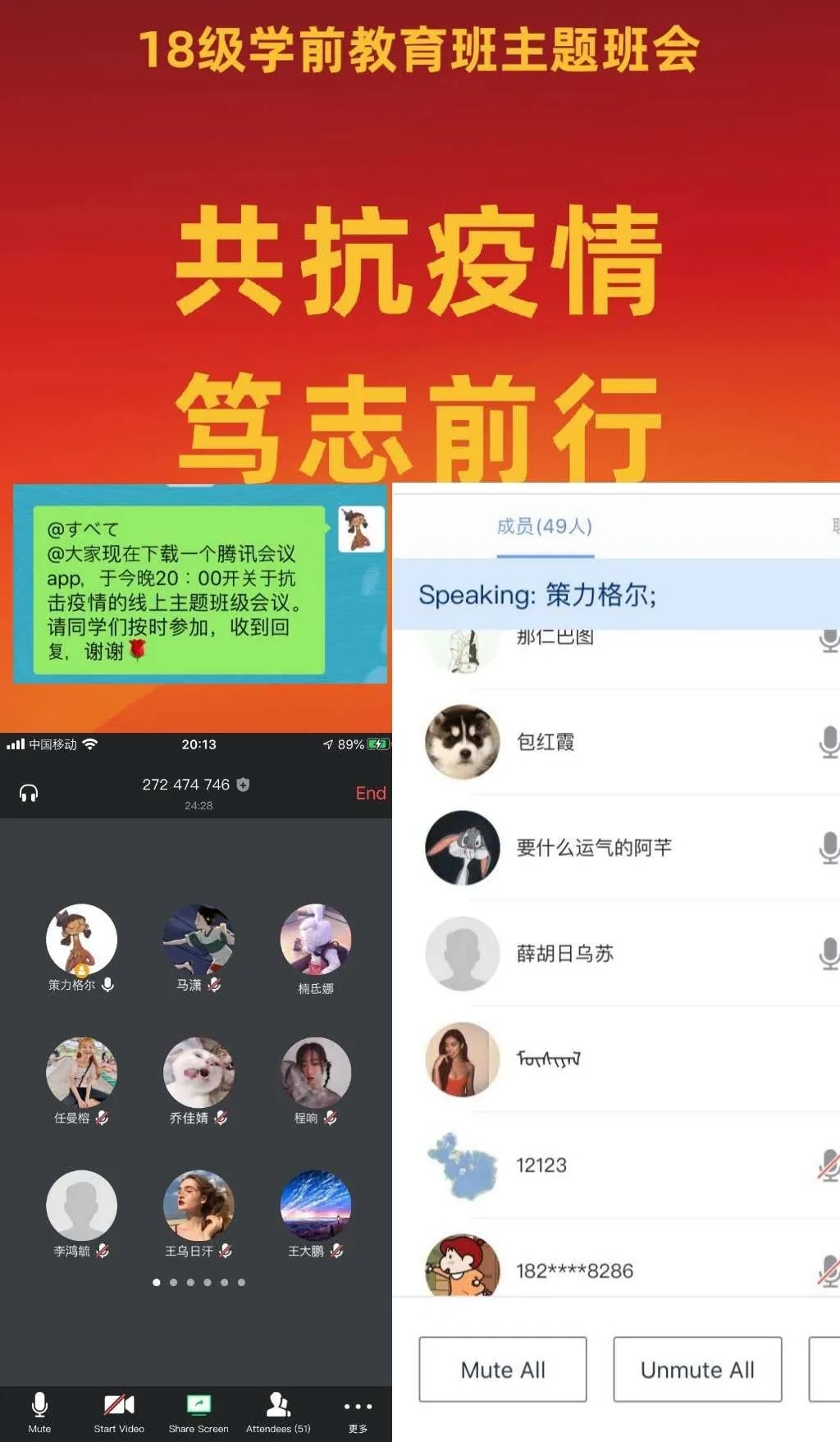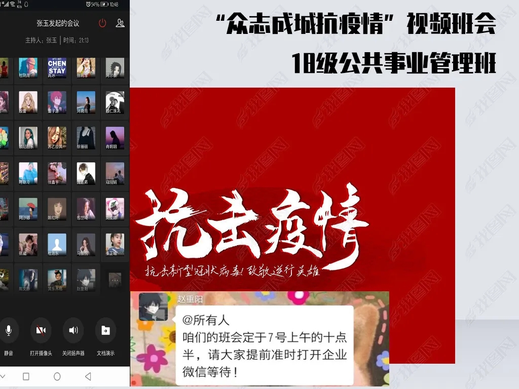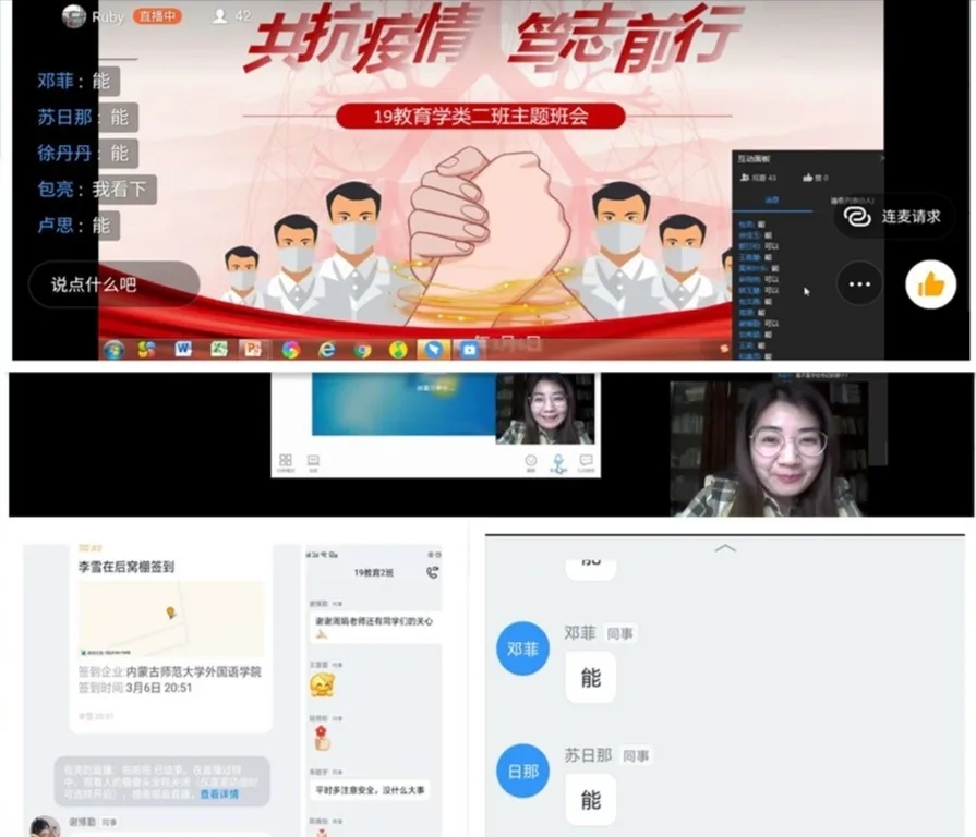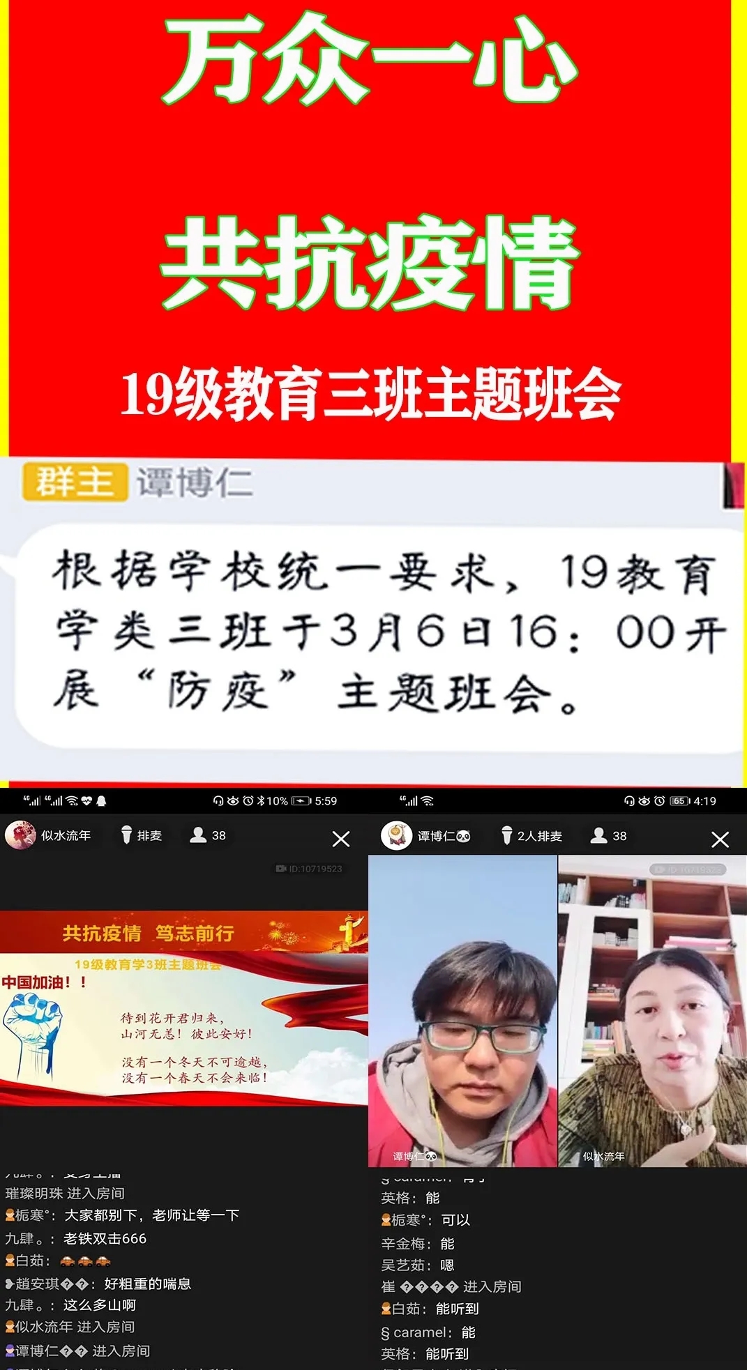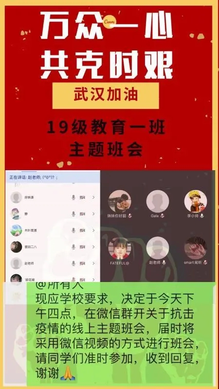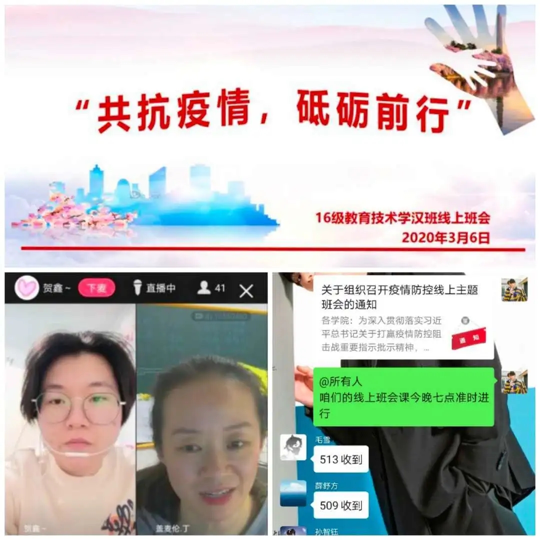 为深入贯彻落实习近平总书记关于打赢疫情防控阻击战重要指示批示精神,保障防控疫情期间“停课不停学”,充分发挥网络育人功能,根据自治区和学校有关工作部署,教育学院各班级组织召开“共抗疫情,笃志前行”为主题的疫情防控线上班会。