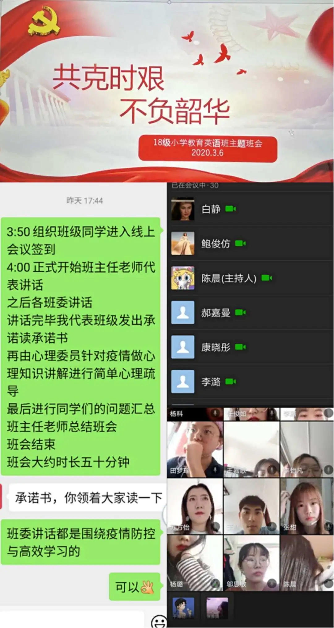 班会由各班班主任主持,充分利用企业微信、微信、QQ、钉钉等现代信息技术手段。班会内容主要围绕空中课堂我打卡、疫情防控我承诺、学霸养成我有招、生涯跨越任我行、排忧解难有我在五个方面展开,旨在按照“按期开课,延期返校”的原则,及时做好学生网络上课动员工作,明确网上教学安排和学习纪律,营造良好的网络学习学风;引导学生正确认识疫情 ,科学了解疫情;倡导学生严格遵守关于疫情防控的各项规定,每日定时在“健康情况日报系统”打卡,彰显当代大学生的责任与担当;激发学生们的学习积极性和主动性,共建团结和谐、健康向上的优良学风;就疫情当下毕业生面临的毕业论文答辩、考研复试、就业等问题,对毕业班学生进行深入细致的解答,开展精准指导服务;准确掌握班级学生思想动态、心理状况、学习生活情况,做好心理关怀。