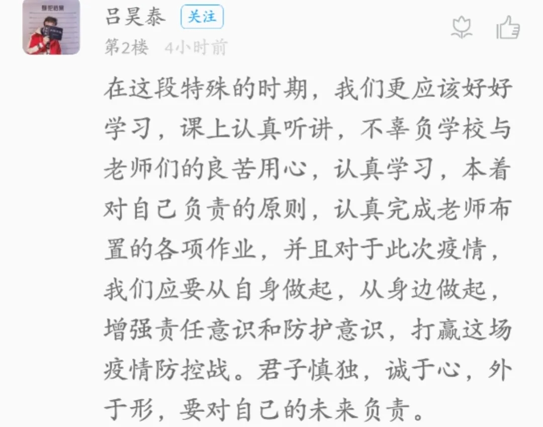 今天,我们又以特殊的方式——网上收看了黄雅丽书记的《开学第一课》。黄书记的讲话让我回想起《孟子》中的话:“生于忧患,死于安乐”,其实不论是国家还是个人都是一样的,作为一个国家,中国以令其他国家望其颈背的能力处理好这场攻坚战。那么身为中国人,身为中国青年的我们更应该传扬国家的精神。“士不可以不弘毅,任重而道远”,这是我们祖先就曾告诉我们的道理。如今当是少年破敌时,是国家需要我们的时候,也是我们自己走向未来的重要时刻。
