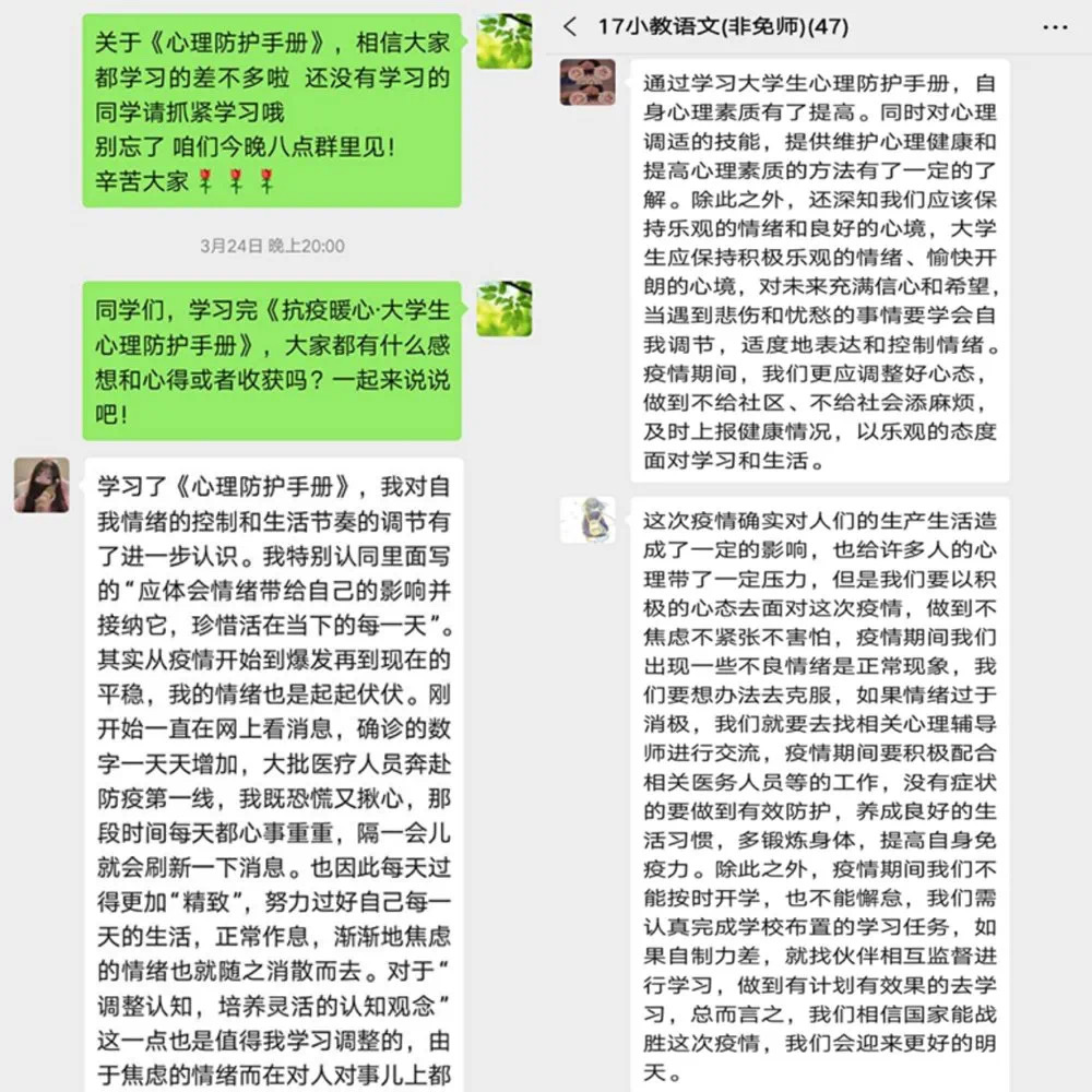 为增强学生的心理保健意识、帮助学生调整心态、积极适应特殊时期的学习生活,我组织班内同学对《手册》内容进行了线上学习,并在324日晚8点在班级微信群内进行了感想与心得交流。