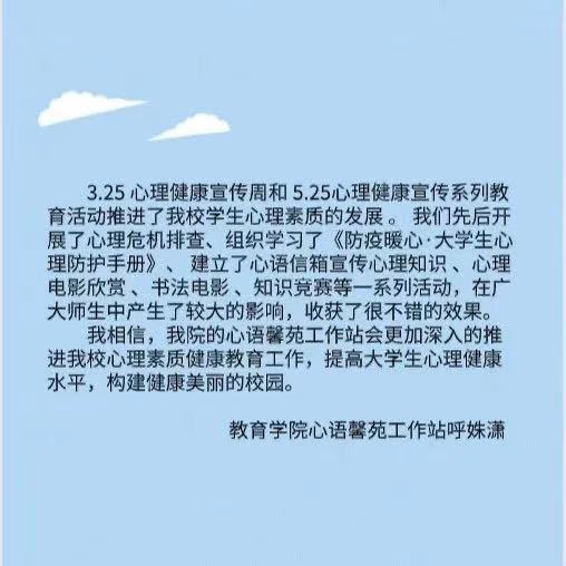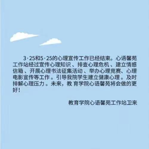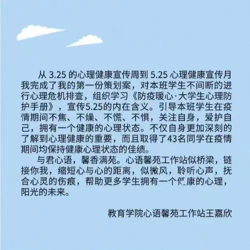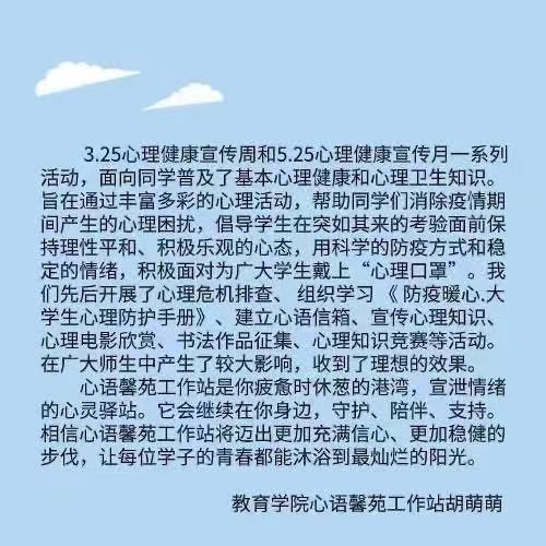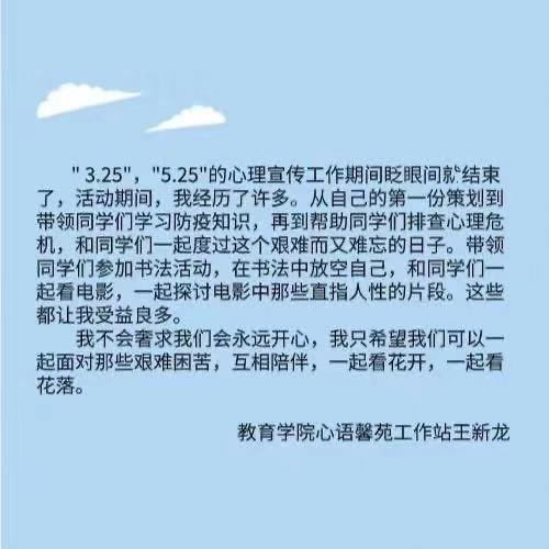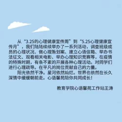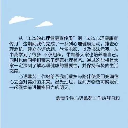 一盏明灯,指引前行,即使深处困境,也能感到温暖相伴——心语馨苑工作站,陪伴师大学子走过多少春秋冬夏?特别是在这特殊的日子里,3.25“心理健康宣传周”、5.25“心理健康宣传月”、组织学习《防疫暖心·大学生心理防护手册》等系列活动从未缺席,心语馨苑工作站活跃在线上帮助广大师生缓解心理压力,提供心理援助和心理支持,科学调适心理,管理不良情绪。前行路上从来没有风调雨顺,愿以专业与陪伴,为你洗礼昨日的阴霾,特此教育学院心语馨苑工作站人员以笔会友,以文抒情,写下了自己的切身体会。