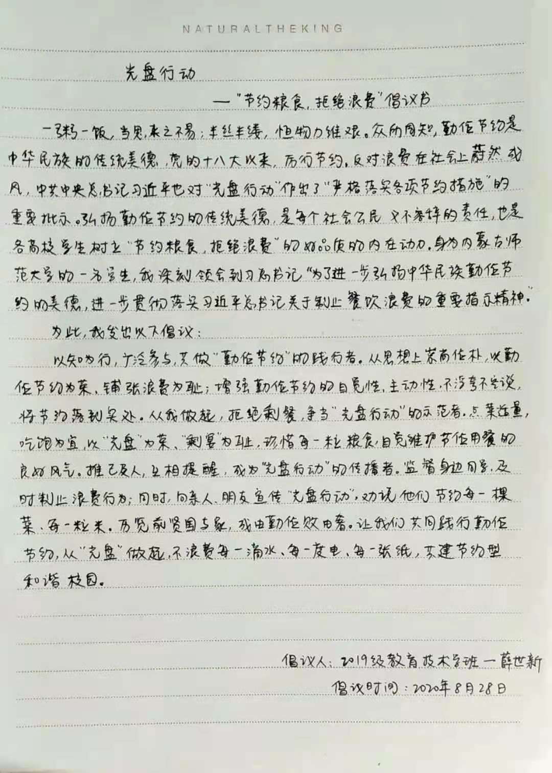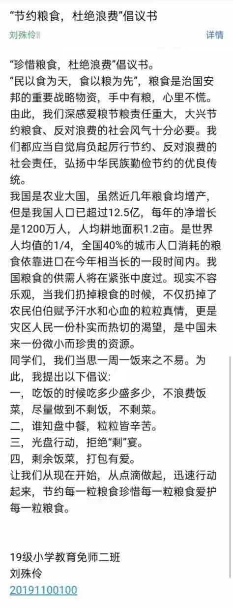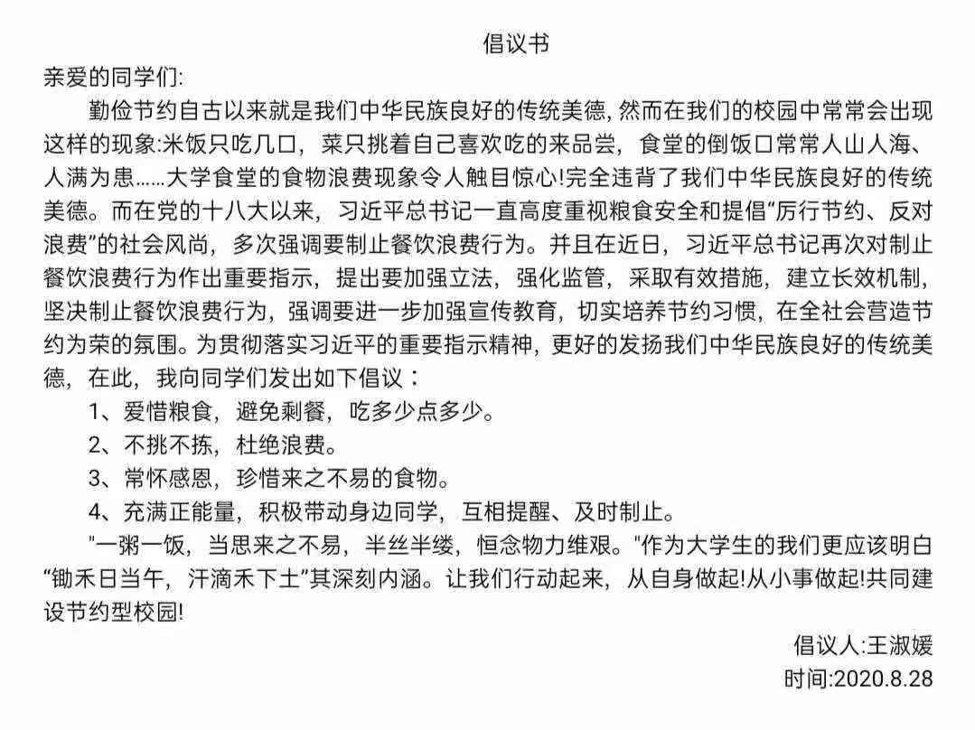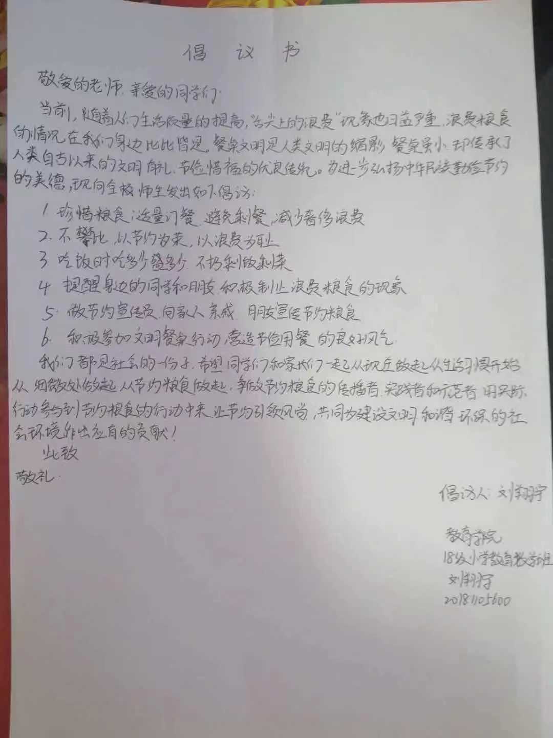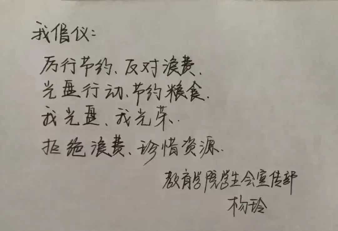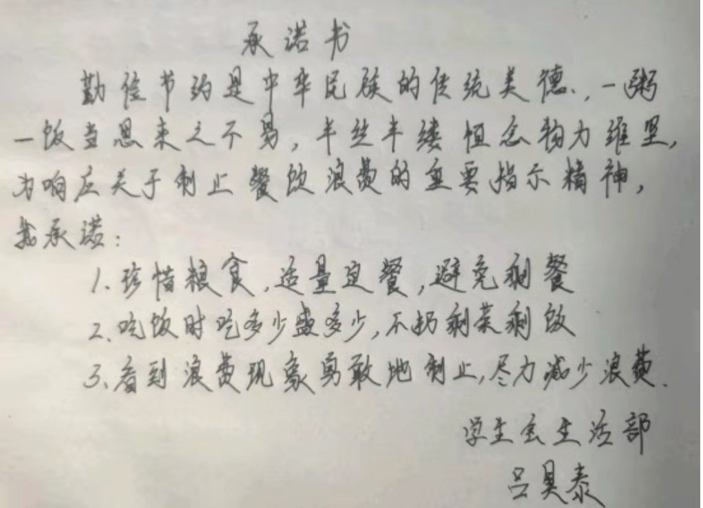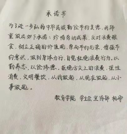 米饭粒粒念汗水,不惜粮食当自悔。谁也不会忘记祖祖辈辈用汗水演绎何处黄土不埋人的壮烈,而如今丰衣足食的我们也绝不能够抛弃艰苦朴素的美德,铺张浪费,为了进一步贯彻落实习近平总书记关于制止餐饮浪费的重要指示精神,教育学院同学们作出以下承诺: