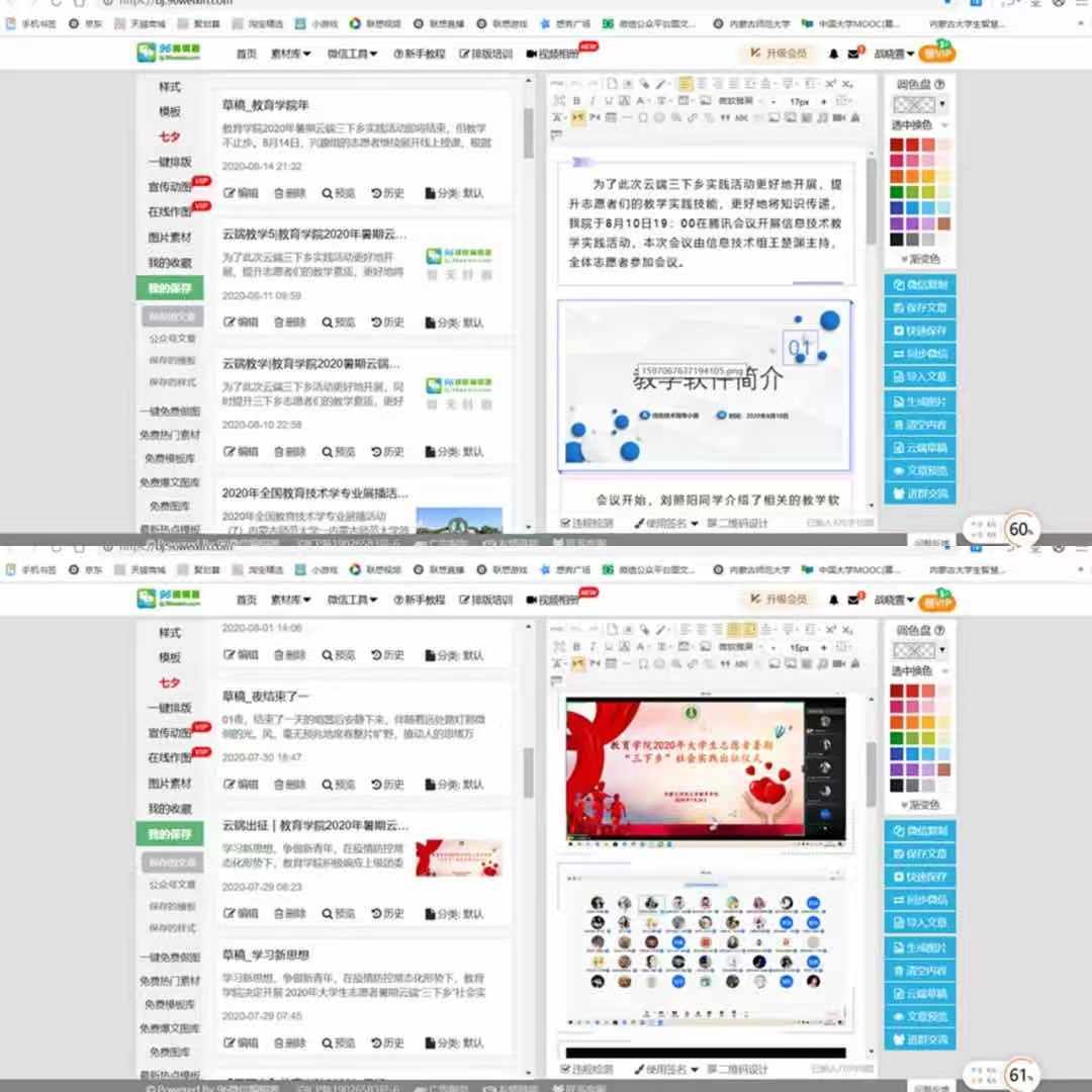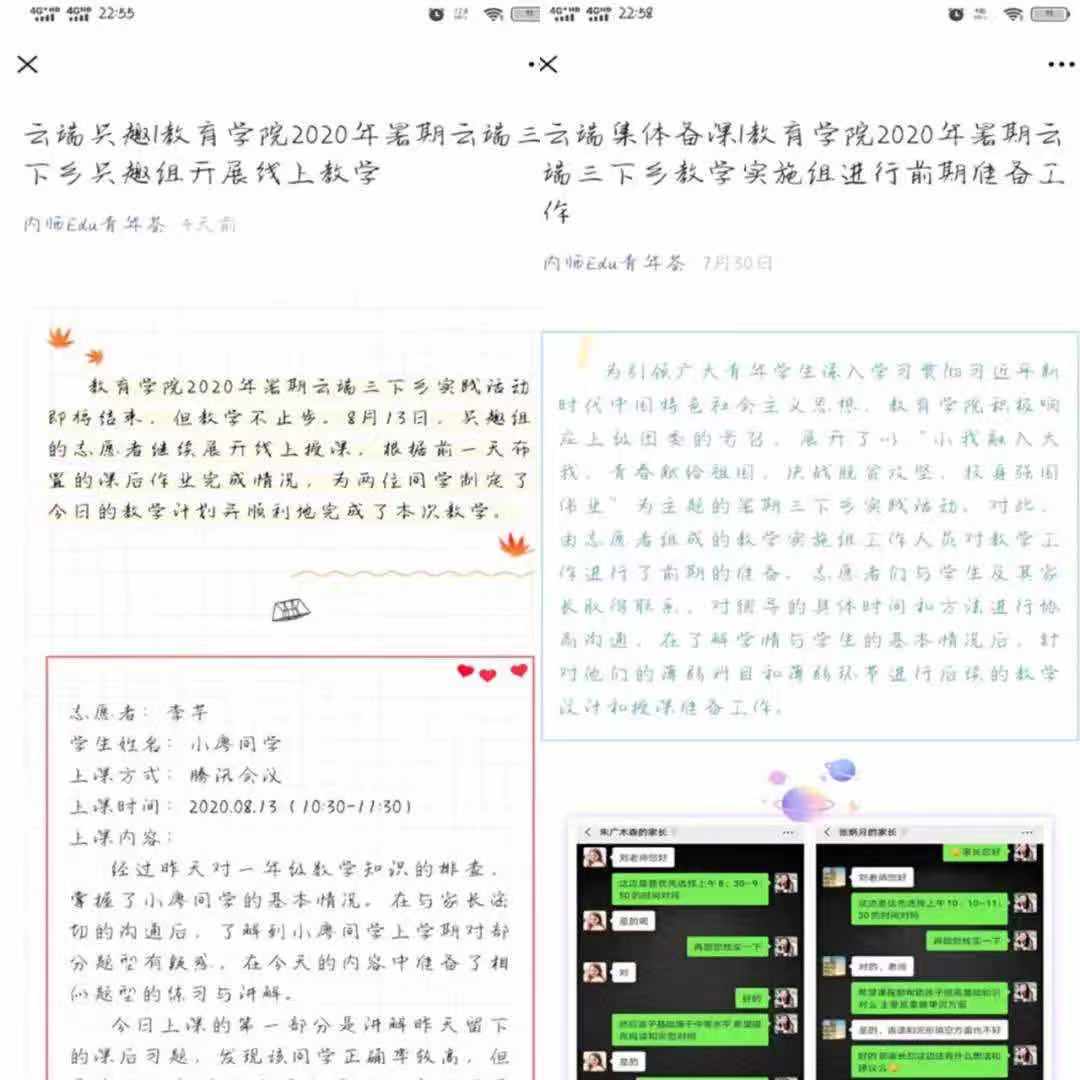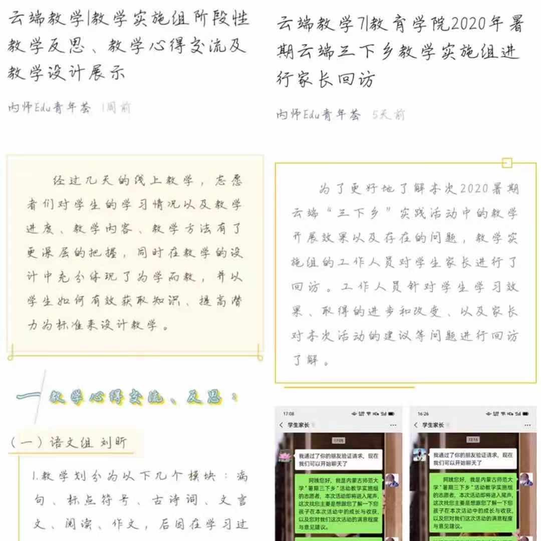 关于教育学院2020年的暑期云端三下乡活动,作为宣传报道组的成员,主要负责此次活动的宣传工作,收集、整合三下乡活动期间志愿者老师的教学工作和党团活动,并图文整合做成推送。这半个月以来,顺利出了5个推送,虽然不多,但受益匪浅。