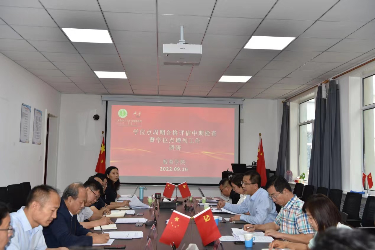 2022年9月16日下午,学校党委委员、副校长宫箭,研究生院院长刘官厅、科技处(社科处)处长贾美林等一行深入教育学院调研指导学位点周期合格评估中期检查暨学位点增列工作。院党委书记周越,党委副书记、院长米俊魁,副院长边琦、赵荣辉以及学院各学位点主任、部分教师参加了本次调研会。