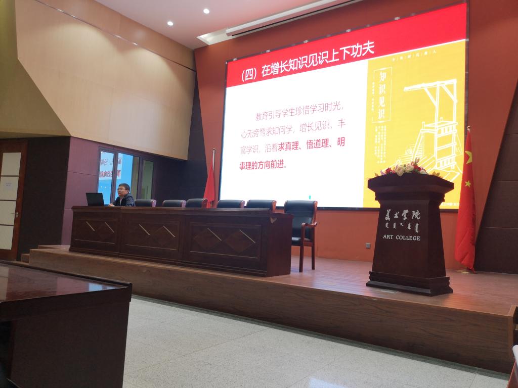 2023年5月22日,教育学院党委副书记兼副院长斯琴满都呼老师在美术学院报告厅为教育学院、美术学院积极分子讲授《习近平总书记关于培养全面发展人才的重要论述》专题党课。本次党课由教育学院学生第三党支部支部书记张玉主持。