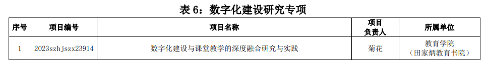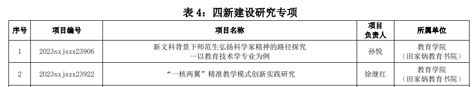 我院师范类专业研究专项获批7项、四新建设研究专项获批2项、课程思政研究专项获批2项、数字化建设研究专项获批1项、其他与学校发展现实相结合的校本研究项目获批1项。