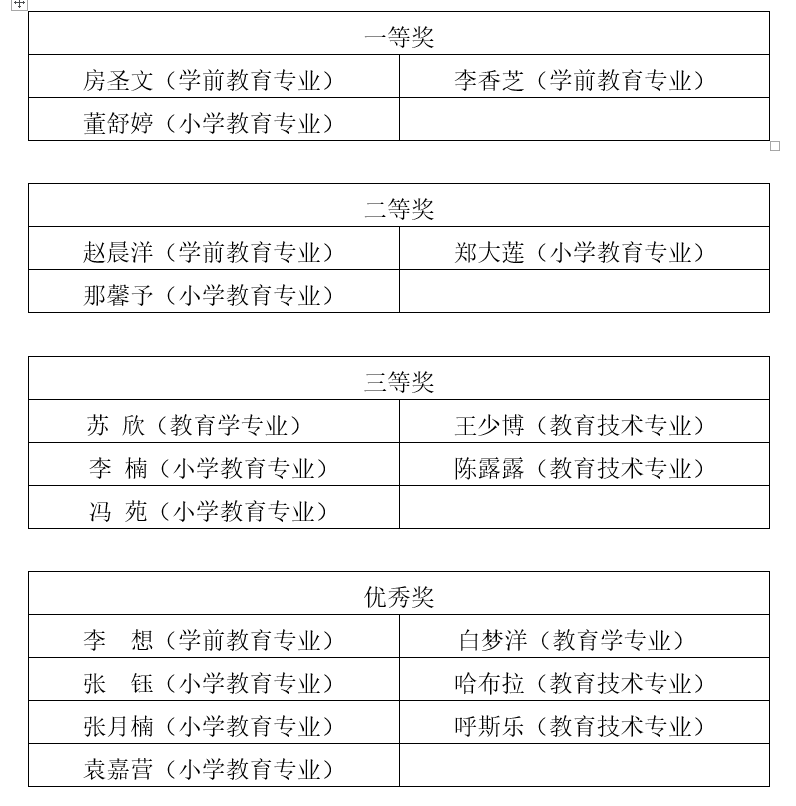 为持续推进学院教育教学质量不断提升,更好贯彻落实双导师制度,助力参赛选手备战。我院邀请校外资深实践导师和校内多名专业教师为参赛选手进行指导。在学院教师和校外实践导师的共同指导下,本次比赛教育学院共有18名选手参加,其中3人获得一等奖,3人获得二等奖,5人获得三等奖,7人获得优秀奖,具体获奖情况如下。