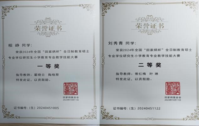 20241010-12日,由全国教育专业学位研究生教育指导委员会主办、田家炳基金会冠名的2024年全国田家炳杯全日制教育硕士专业学位研究生小学教育领域教学技能大赛决赛在沈阳师范大学成功举办,我院小学教育研究生相峥、刘秀青两位选手在比赛中凭借扎实的专业知识、出色的综合素质,最终取得一、二等奖的好成绩,这是对学生努力与指导教师团队的肯定,更是对我院教育教学质量的有力肯定。