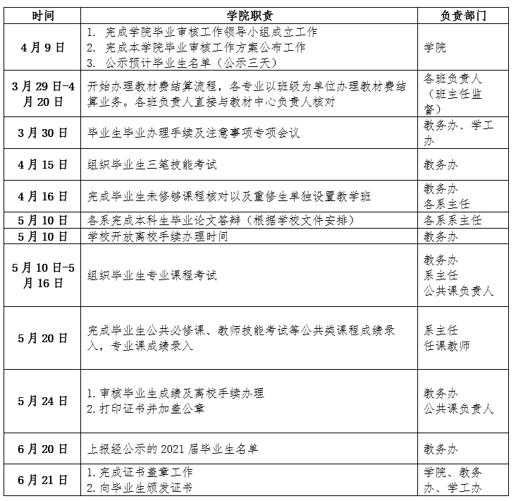 根据学校《关于成立2021届本专科毕业生工作领导小组及毕业生相关工作安排的通知》精神,要求学院各部门配合2021届毕业生各项工作,我院特制定2021届本科毕业生工作领导小组及毕业生相关工作安排,并经学院党政联席会议讨论确定,具体安排如下: