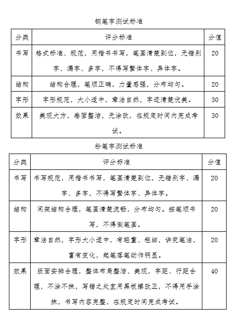 考试分为粉笔字考试、钢笔字和应用文写作,各专业均需参加“三笔”技能考试。