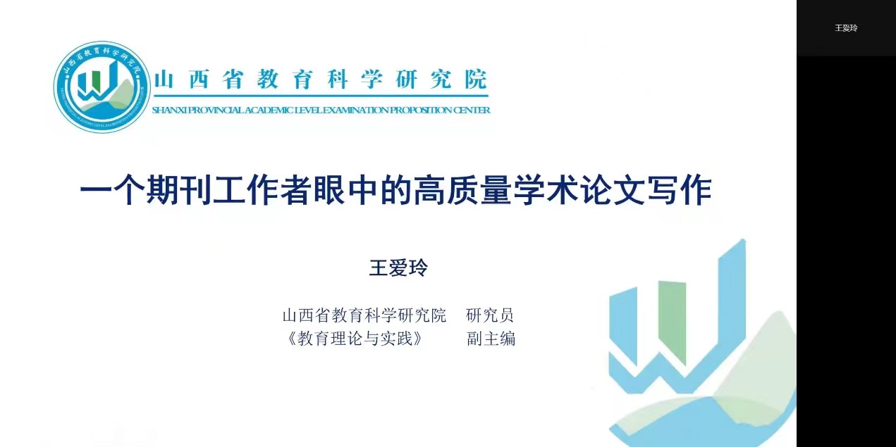 2022623日下午,山西省教育科学研究院期刊编辑中心主任、《教育理论与实践》副主编王爱玲研究员,通过网络视频会议为我院师生作了题为“一个期刊工作者眼中的高质量学术论文写作”的学术讲座。学术讲座由教育学院副院长赵荣辉教授主持,我院教师、研究生和本科生及校外师生近200人在线上聆听学术报告。在两个小时的学术报告中,王爱玲研究员围绕着高质量学术论文的八个要素,以及写作选题、资料准备、论文格式等方面全方位、多视角、分环节介绍了完成一篇高质量学术期刊论文的主要着力点。此次报告是我院学术校庆系列讲座之一,旨在提高我院师生的科学研究水平,激发研究学习兴趣,推动教育学学科建设与发展。